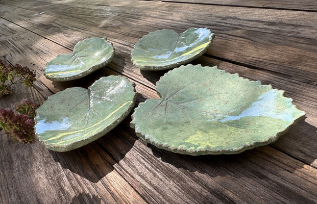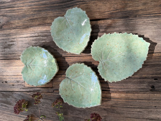 Blätter Schälchen aus grauem Ton mit Pyritspots, handgeformt, hochgebrannt, spülmaschinengeeignet.