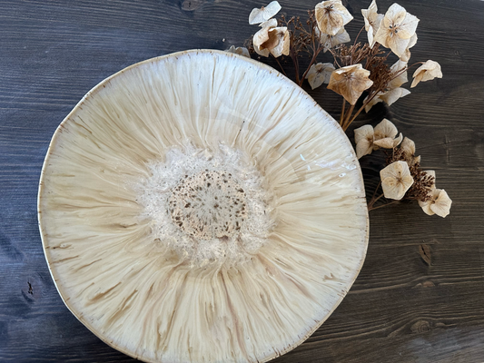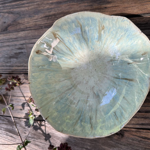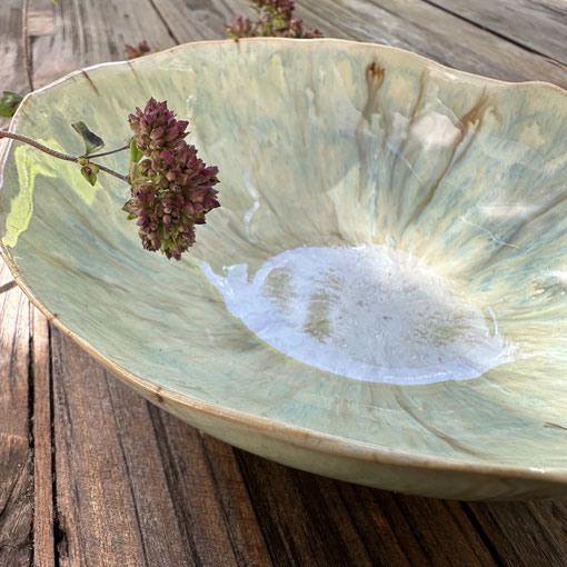 Schale mit 30 cm Durchmesser aus weissem Ton mit Pyrit Spots, handgeformt, hochgebrannt bei 1220 Grad. Sie ist durch den Hochbrand spülmaschinengeeignet. Kann für Salat, Obst oder Pasta etc. verwendet werden.