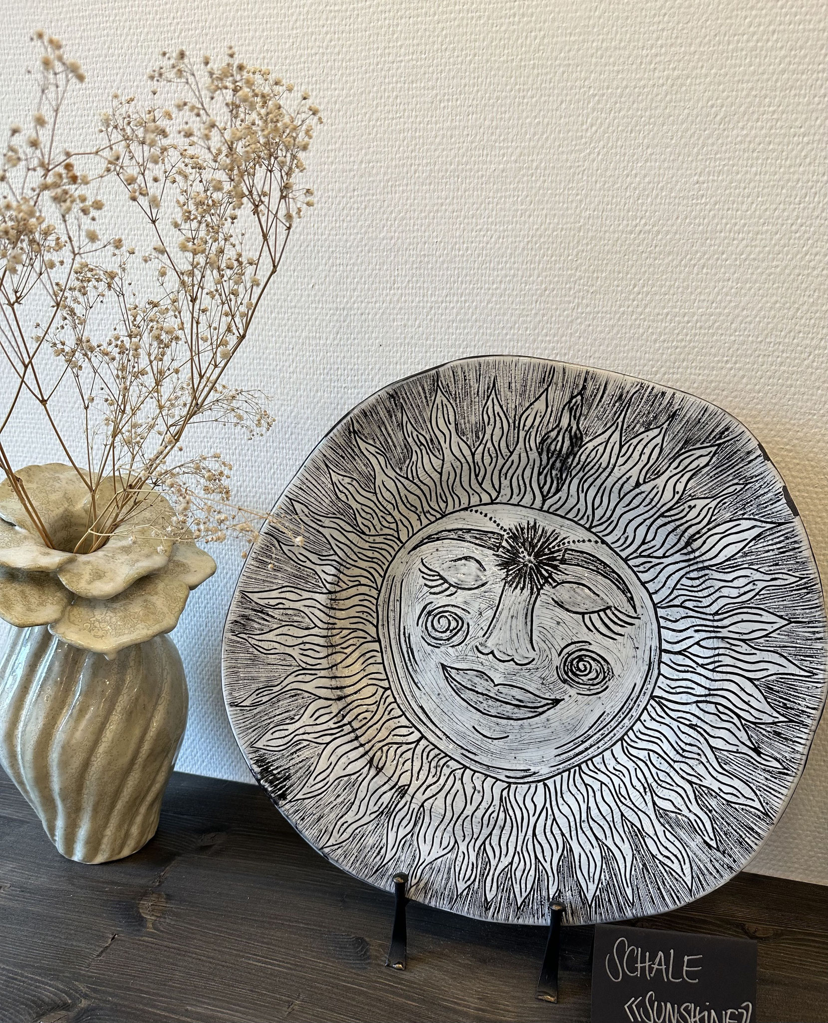 Schale aus schwarzem Ton, Oberfläche Porzellan, Sonne Sgraffito-Technik, handgeformt, hochgebrannt, spülmaschinengeeignet.