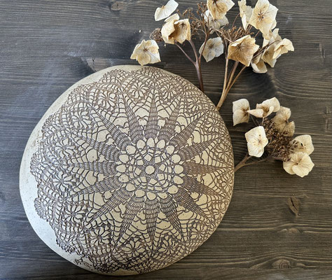 Schale mit 30 cm Durchmesser aus weissem Ton mit Pyrit Spots, handgeformt, hochgebrannt. Rückseite mit bronzefarbenem Relief. Spülmaschinengeeignet. Kann für Salat, Obst oder Pasta etc. verwendet werden.