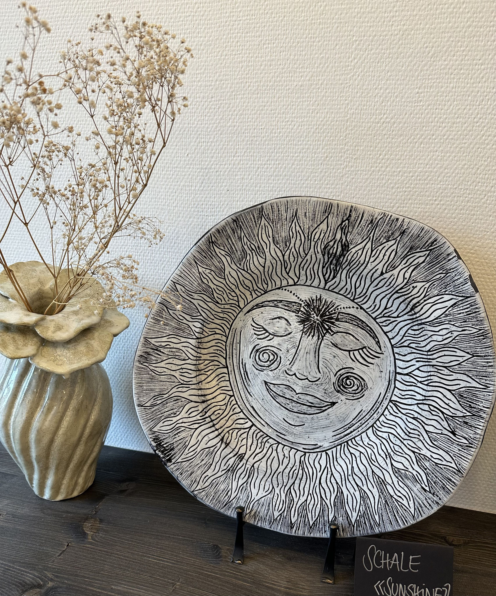 Schale aus schwarzem Ton, Oberfläche Porzellan, Sonne Sgraffito-Technik, handgeformt, hochgebrannt, spülmaschinengeeignet.