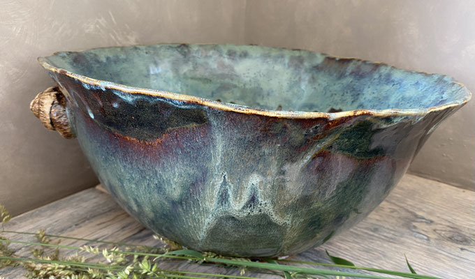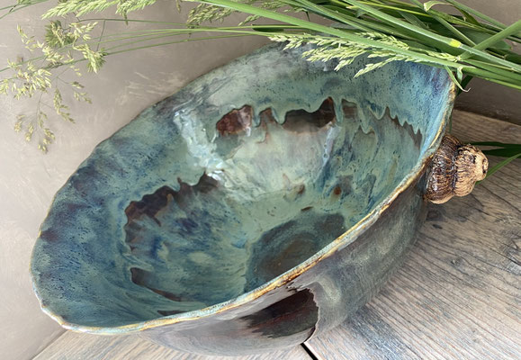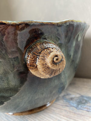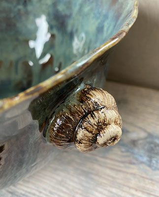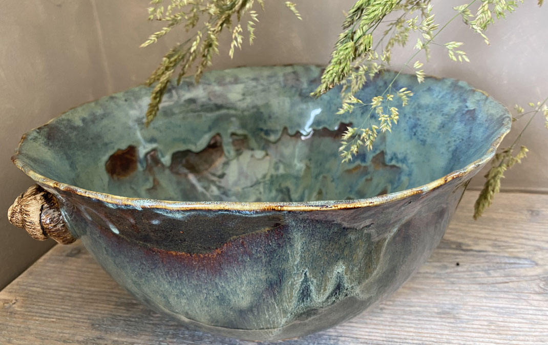 Grosse Schüssel und Schnecken rechts und links aus weissem Ton handgeformt, hochgebrannt bei 1220 Grad, wasserdicht. Sie ist durch den Hochbrand spülmaschinengeeignet. Kann für Salat, Obst oder als 🍾-Kühler benutzt werden.