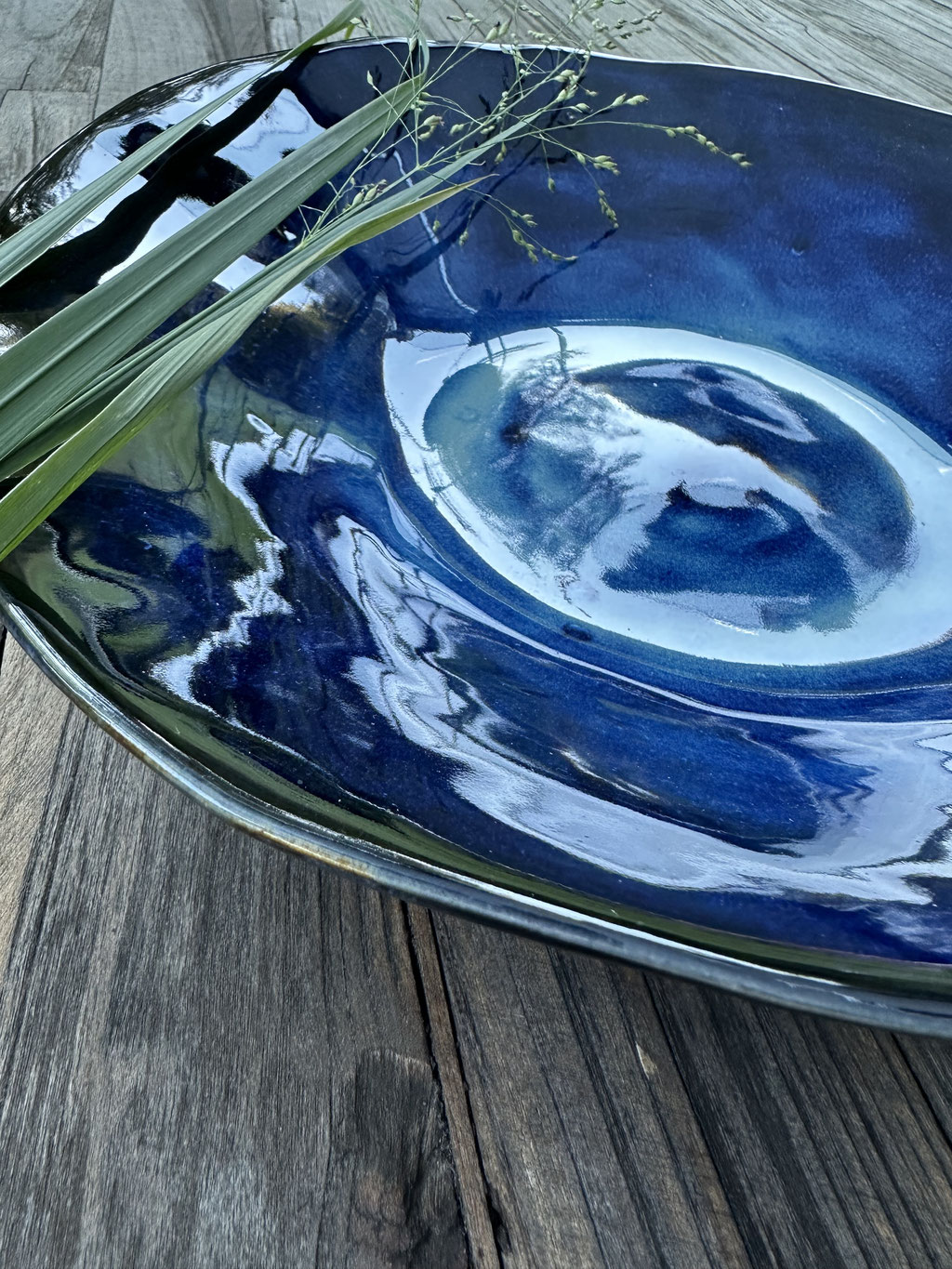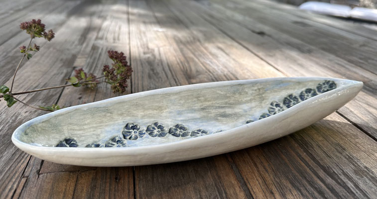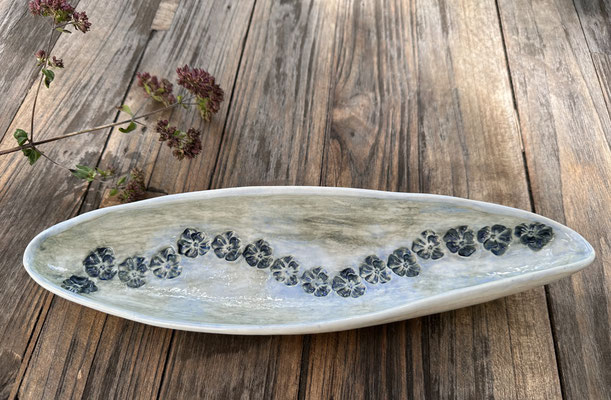 Organisch ovale Schale mit Veilchen-Prägung blau. Porzellan. Hochgebrannt. Spülmaschinengeeignet.
